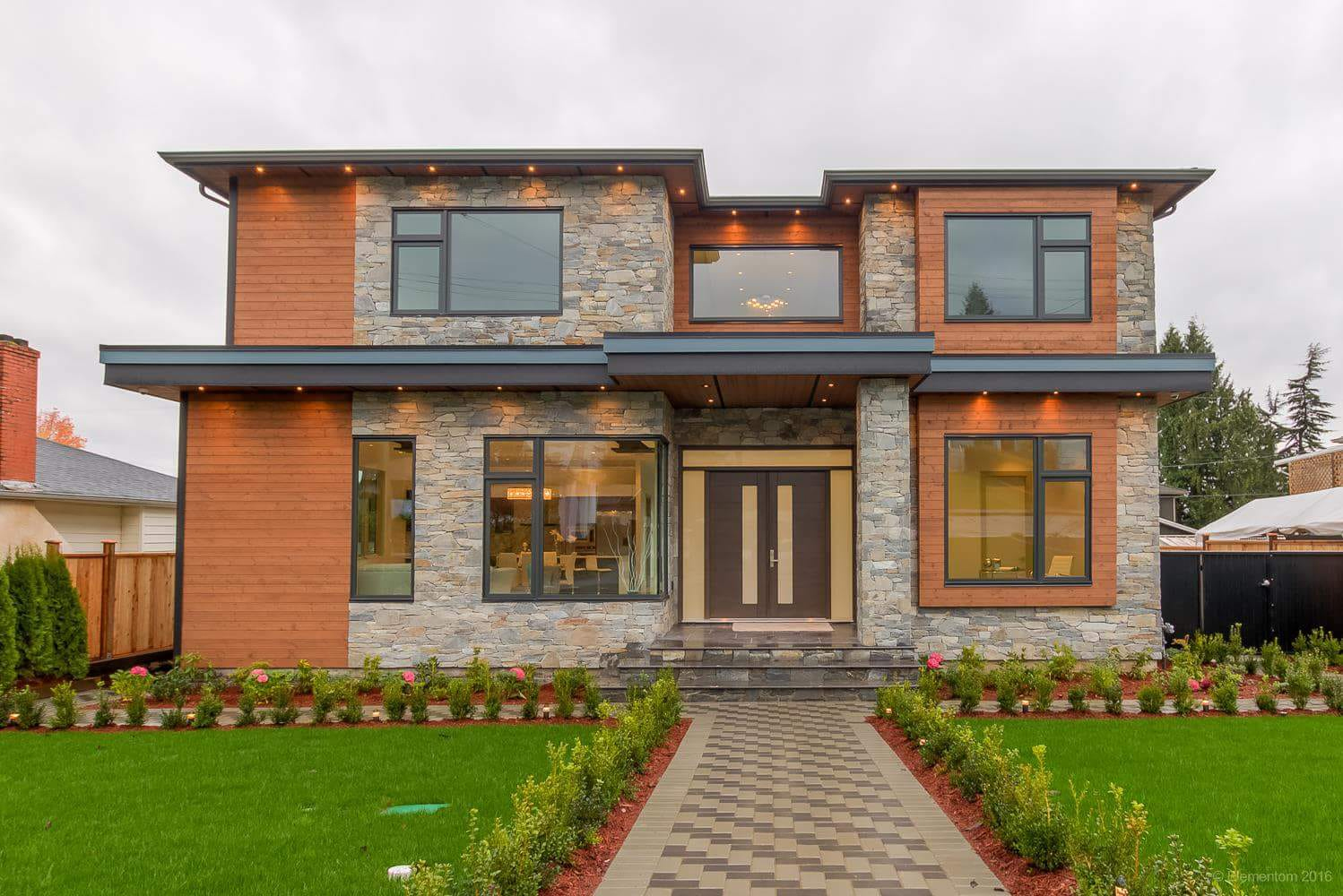 The big sell: This 2016 home exudes West Coast style with an exterior that combines wood and stone, coupled with deep soffits and down lighting.